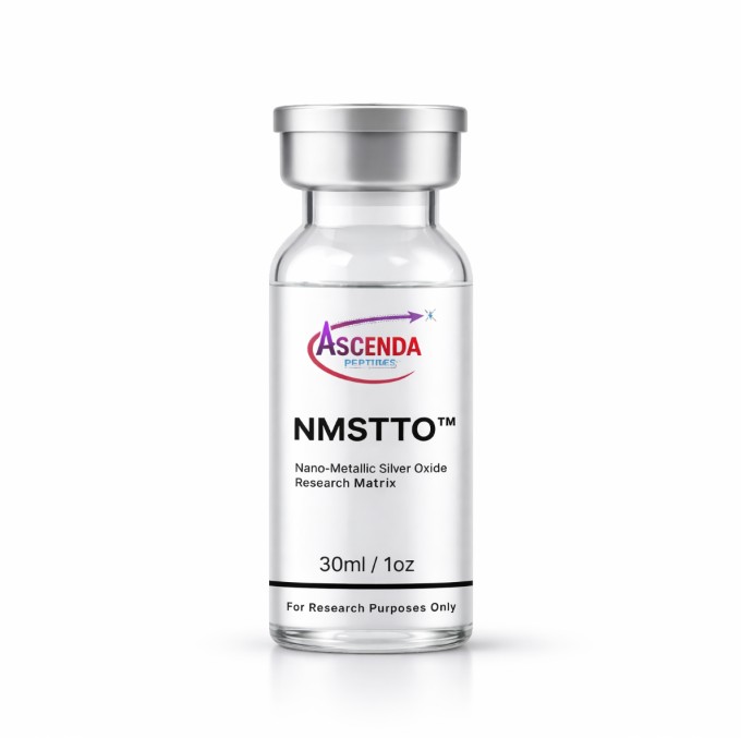 The Ascenda NanoMatrix™ (NMSTTO) is a next-generation nano-metallic silver oxide research matrix [cite: 223] designed as a superior alternative to legacy bacteriostatic water[cite: 222]. Engineered at the nanoscale, it creates a persistent antimicrobial field that protects the molecular integrity of fragile peptide chains across repeated vial withdrawals[cite: 224, 212].